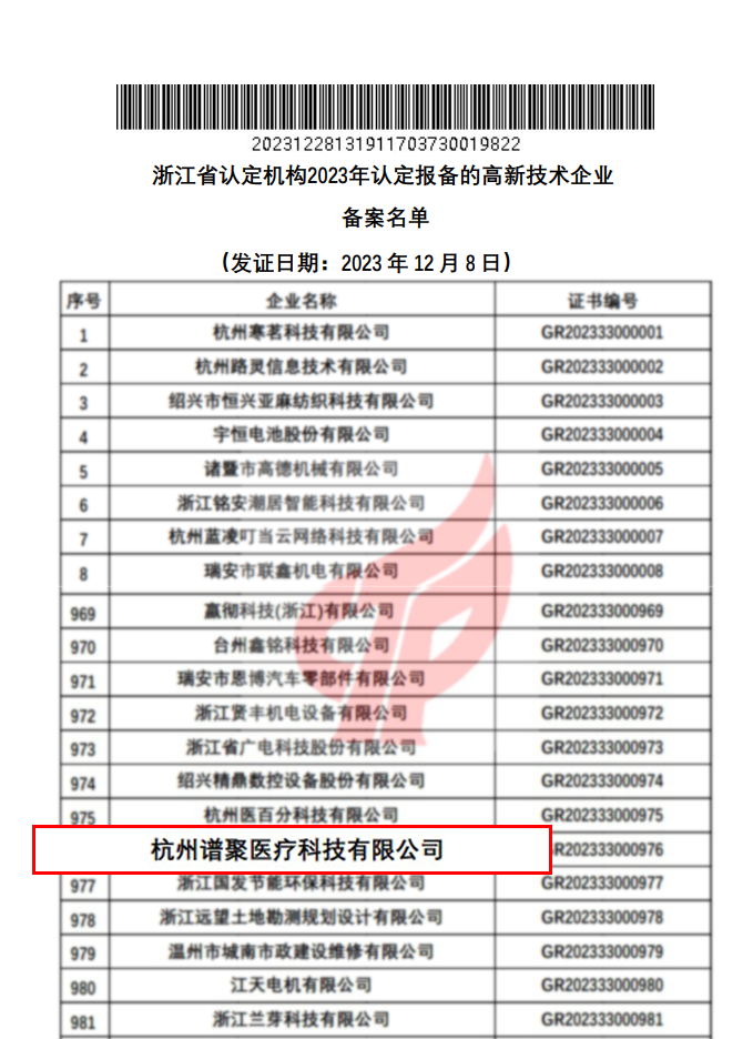 近日,谱聚医疗凭借产品创新能力、核心技术研发能力以及自主知识产权优势,顺利通过2023年认定,荣获国家“高新技术企业”证书。